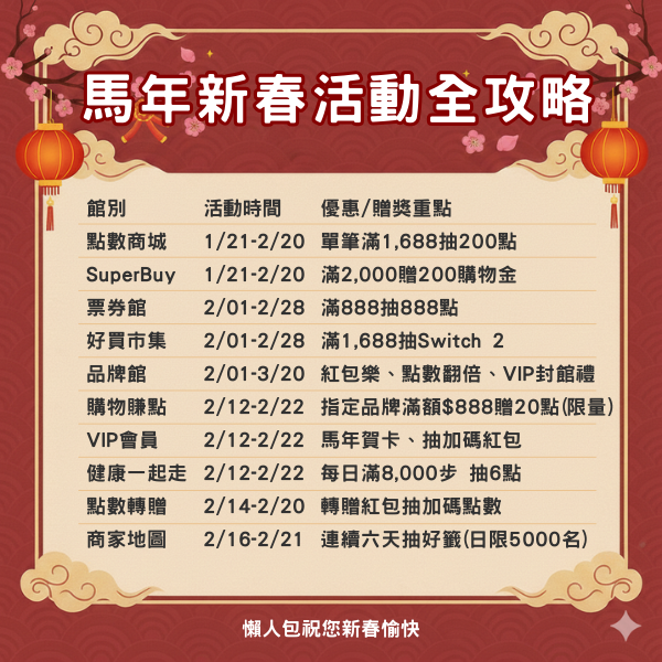 2/16(除夕)-2/21(初五)每日9:00–23:59「商家地圖新春抽好運」活動(上午9點開放抽獎,每日限量5,000名,抽完為止)。