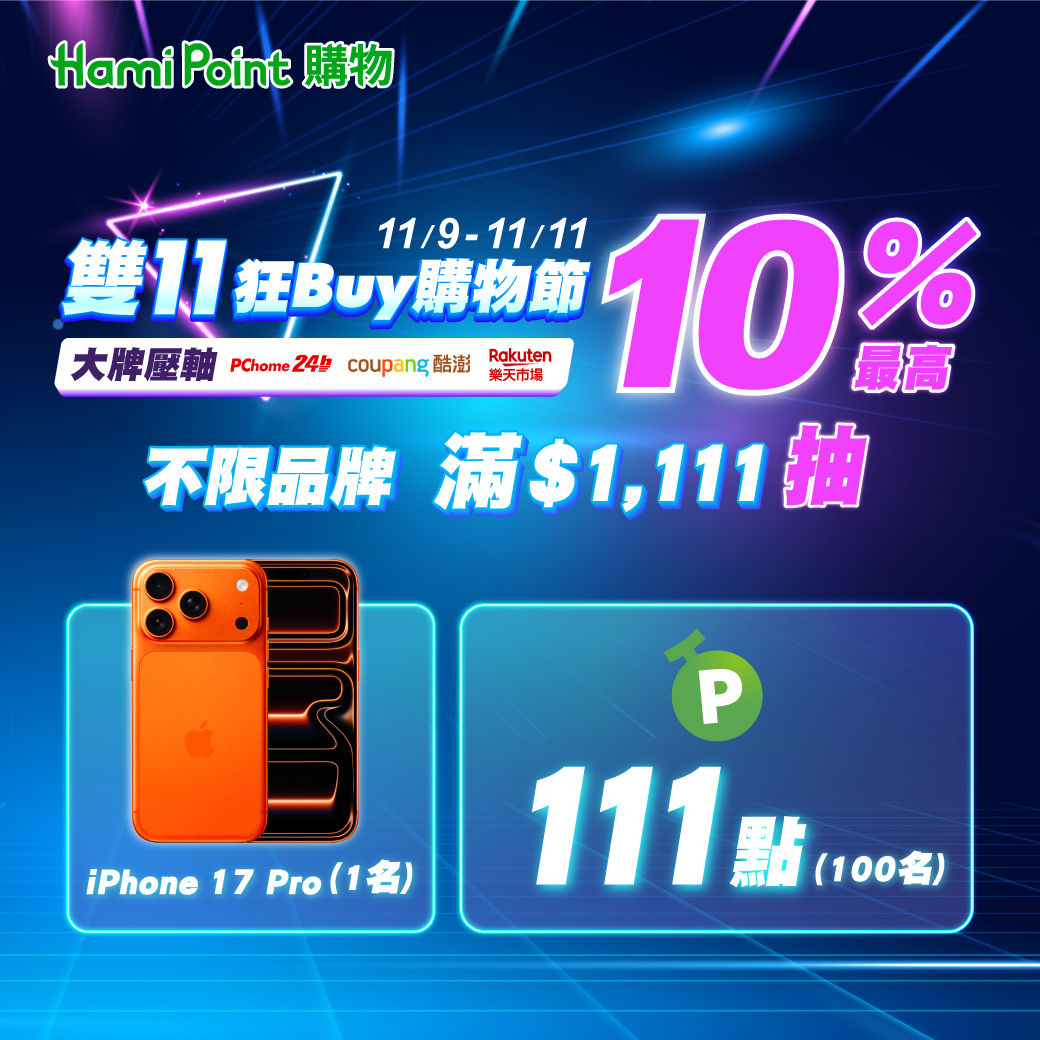 【Hami Point購物】雙11狂Buy購物節 大牌壓軸最高10%,滿額抽 iPhone17Pro!