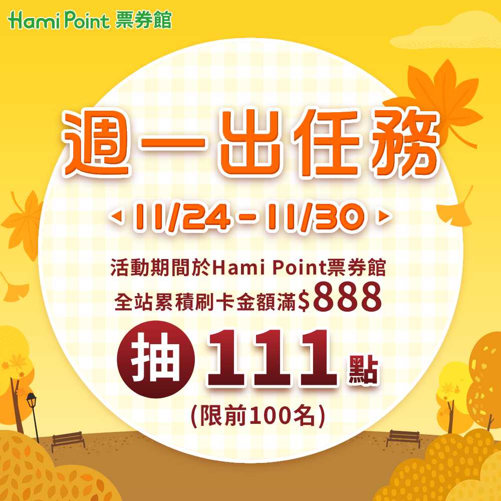 【週一出任務】11/24-11/30於Hami Point票券館全站累積刷卡金額滿$888抽111點!