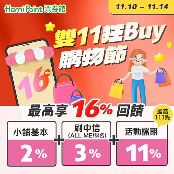【週一出任務】11/10-11/16單筆訂單使用Hami Point抵扣1,111點(含)以上,贈送111點Hami Point(限前90名)