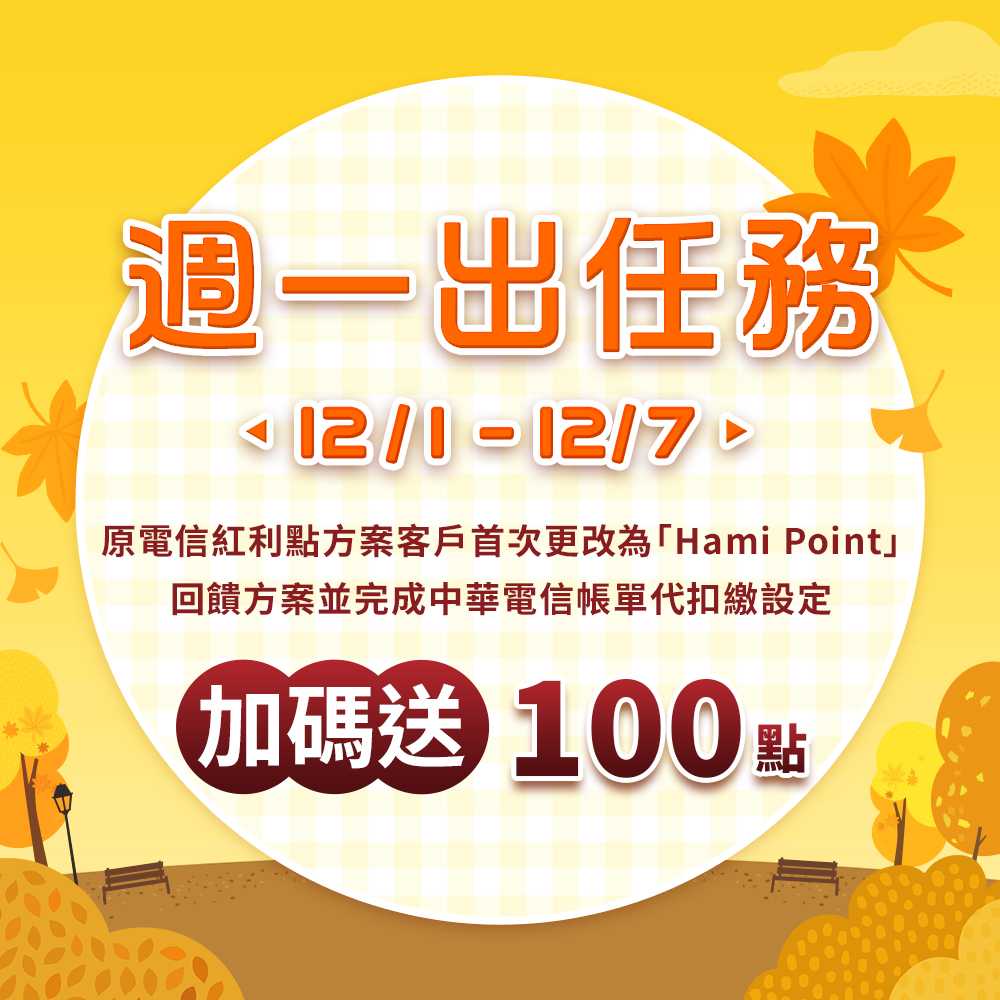 【週一出任務】12/1-12/7 原電信紅利點方案客戶首次更改為「Hami Point」回饋方案並完成中華電信帳單代扣繳設定,加碼送 100點。