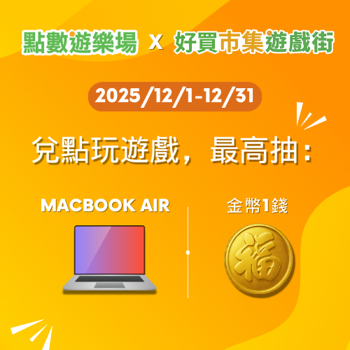 【歲末大回饋瘋兌點】玩遊戲,抽Macbook Air還有金幣!