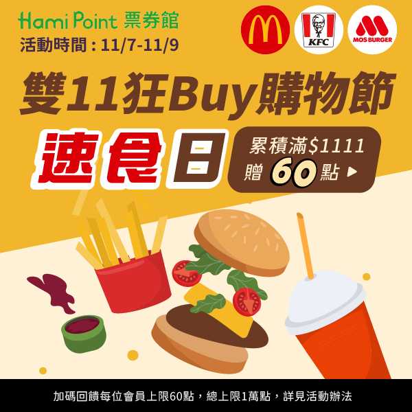 【票券館】雙11狂Buy購物節速食日-累積滿$1111贈60點