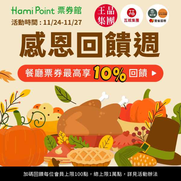 【票券館】感恩回饋週|餐廳票券 -最高享10%回饋