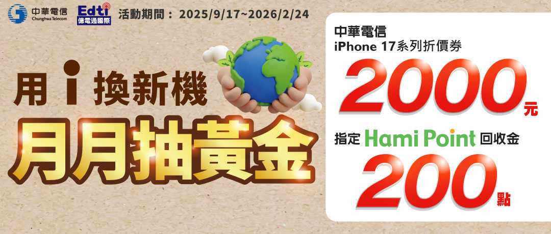 快把舊手機回收起來!參加「月月抽黃金」活動,用 i 換新機,享受市場最高回收價,還能拿指定 Hami Point 限時加碼 200 點!