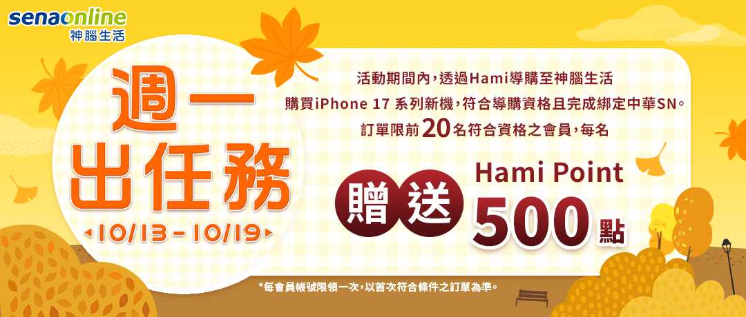 凡於2025/10/13– 2025/10/19期間,透過以下連結 進入神腦生活購買 iPhone 17 系列新機,最高享2% Hami Point回饋無上限!