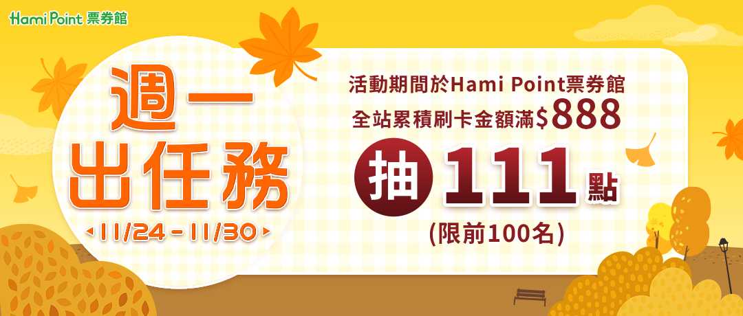 1. 本活動限2025/11/24-11/30(截至23:59止),透過「Hami Point官網或Hami Pay App」 前往「Hami Point票券館」完成消費,累計消費金額滿$888者,經審核訂單符合資格之名單,抽111點,共計100名。