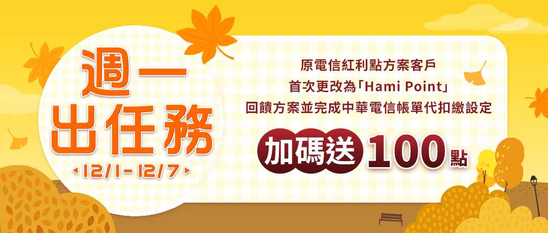 1. 本活動限於 2025/12/1-2025/12/7 (含)前將中華電信聯名卡回饋方案由電信紅利點修改為Hami Point,且須完成設定中華電信帳單代扣繳。