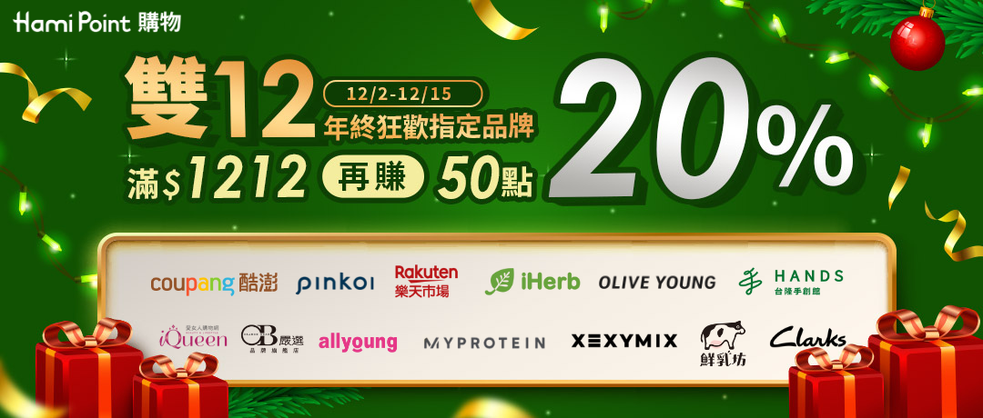 活動期間透過 Hami購物 前往指定品牌網站完成訂單,享加碼最高20%回饋,詳見下方注意事項說明。