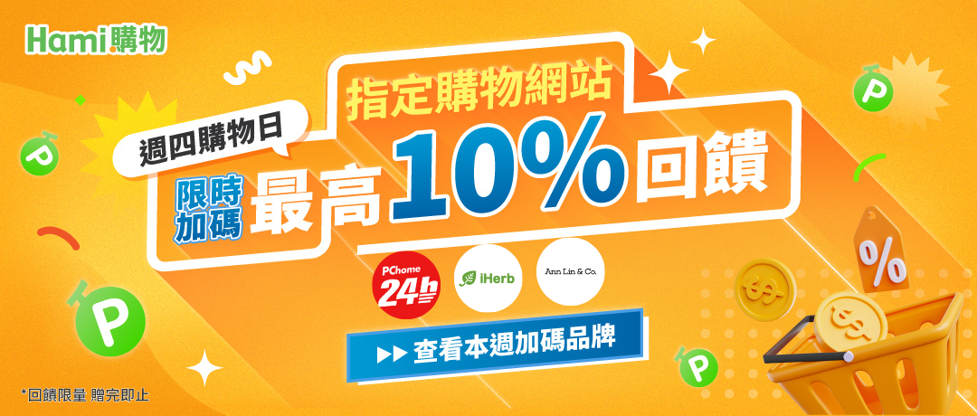 12/18-12/31 每週四,指定時段透過 Hami購物 指定品牌導購連結完成訂單,享加碼回饋!回饋限量,贈完即止。