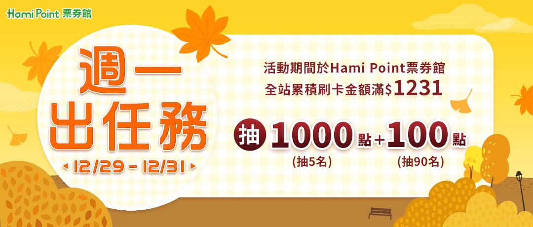 1. 本活動限2025/12/29-12/31(截至23:59止),透過「Hami Point官網或Hami Pay App」 前往「Hami Point票券館」完成消費,累計消費金額滿$1,231者,經審核訂單符合資格之名單,抽77點,共計100名。