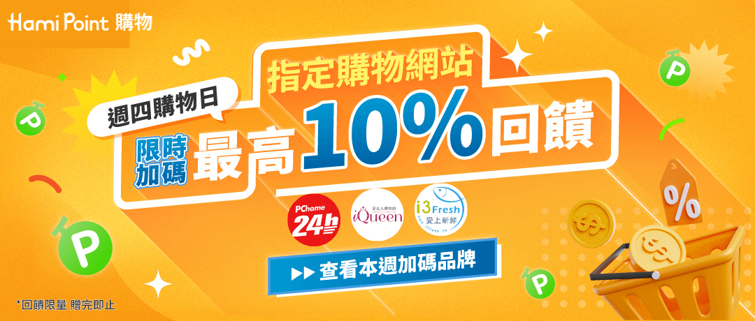 1/1-1/31 每週四,指定時段透過 Hami Point購物 指定品牌導購連結完成訂單,享加碼回饋!回饋限量,贈完即止。