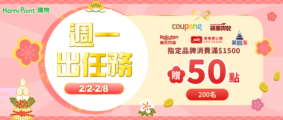 活動期間透過 Hami Point購物 前往指定品牌網站 (酷澎、樂天市場、快車肉乾、英國潔、金車線上購),單筆實際消費滿$1,500贈50點(限前200名),加碼贈點限量,贈完即止。