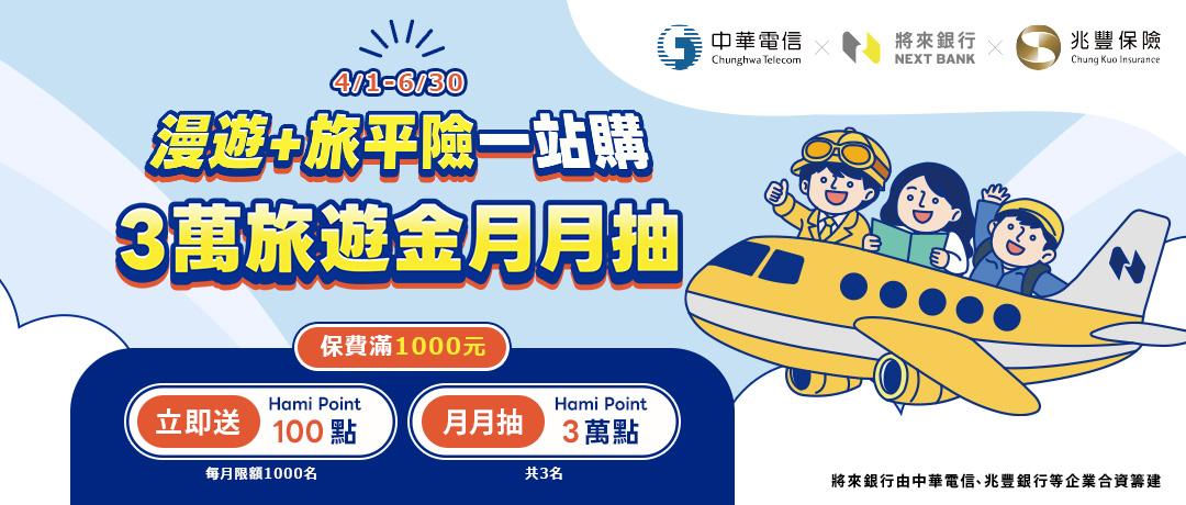 當次投保成功保險費滿1,000元(含以上),加碼抽旅遊金3萬點Hami Point,每梯次抽1名,共3名。