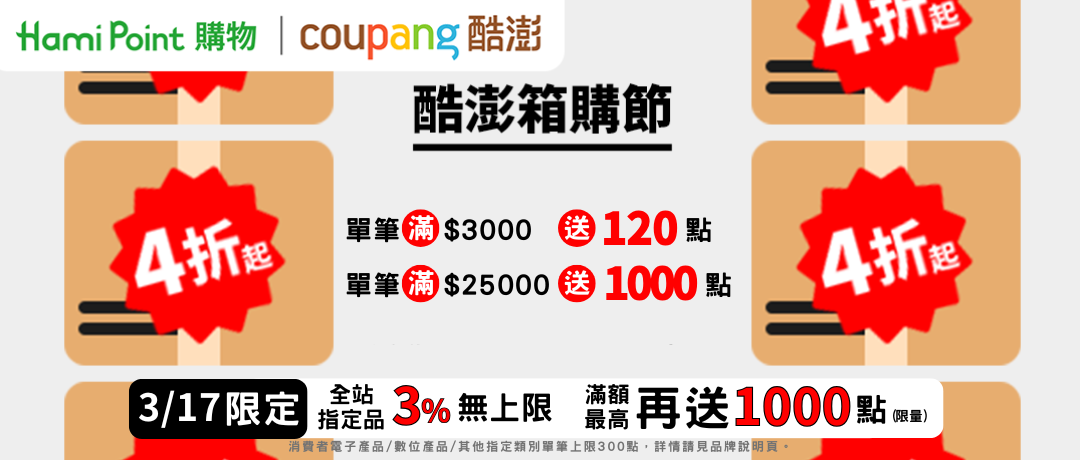 3/17 透過 Hami Point 購物 前往 酷澎 網站完成訂單,享加碼最高 3% 回饋(原2%),詳見下方注意事項說明。